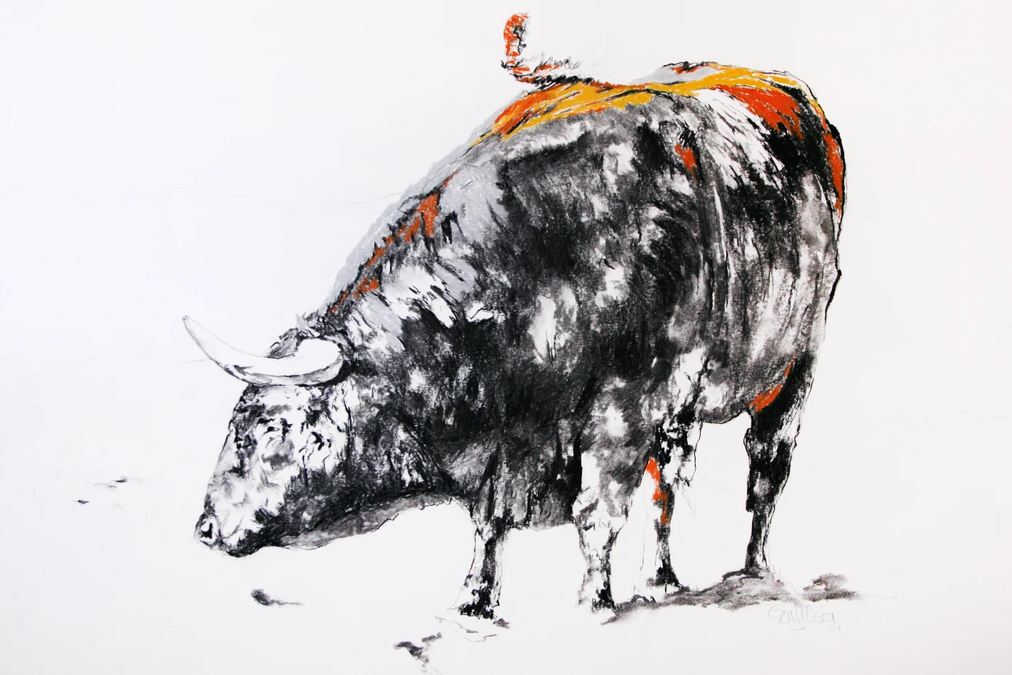 La obra muestra la figura del toro con una fuerza serena y contenida, destacando su presencia y carácter a través de un trazo expresivo y gestual. La combinación de grafito y carboncillo aporta profundidad y contraste, mientras que los acentos de pastel introducen matices que dinamizan la composición. Una pieza de gran carga simbólica que equilibra potencia, calma y expresividad.