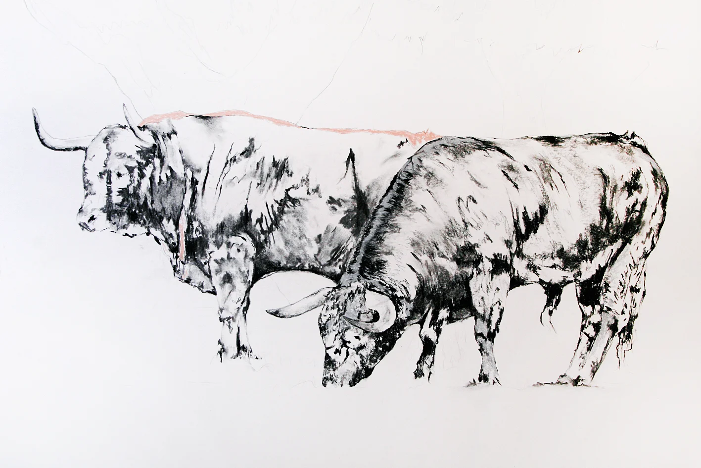 La composición presenta dos toros en diálogo silencioso, captados desde una mirada pausada y natural. El trazo suelto y expresivo define las formas sin rigidez, sugiriendo movimiento y carácter más que detalle. La obra transmite equilibrio, respeto y una conexión directa con el paisaje y la esencia del animal, reforzada por sutiles acentos de color que aportan profundidad y ritmo visual.